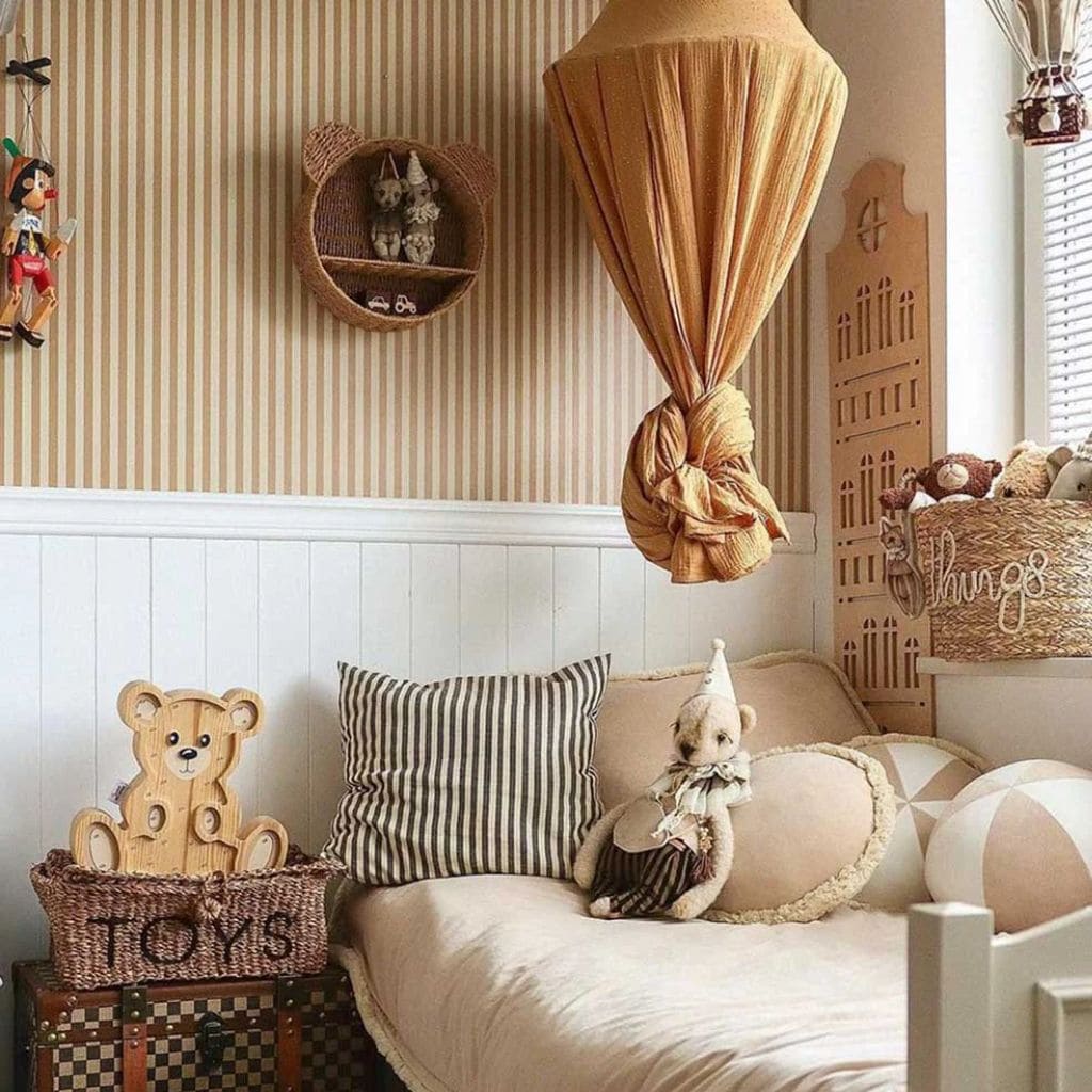 Ce papier peint à rayures fines (moins de 1,5 cm de large) apporte structure et raffinement à n’importe quelle pièce. Parfait en combinaison avec des boiseries, il s’intègre aussi bien dans des univers doux et féériques que dans des décors classiques minimalistes.