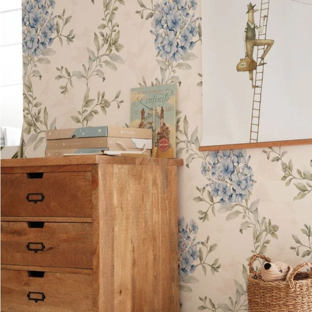 Ce papier peint présente de magnifiques fleurs bleues dans un motif dense mais harmonieux, grâce à des couleurs douces et raffinées.