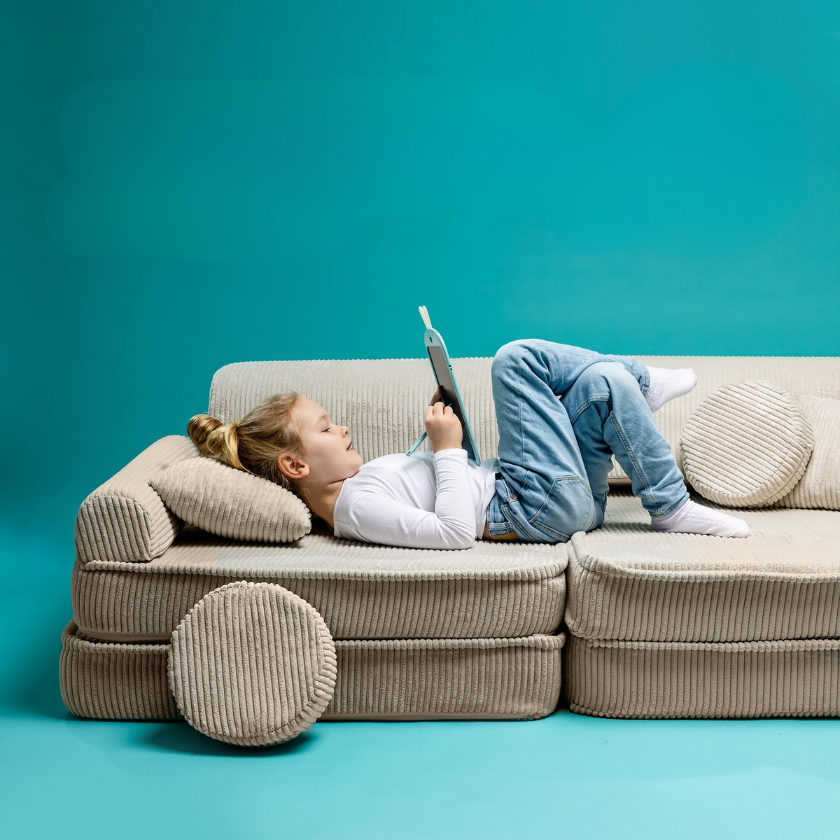 Nuestros sofás modulares, pufs y bloques de juego blandos encajan armoniosamente en salones y dormitorios. Un diseño limpio, colores suaves y materiales premium para estimular la imaginación cada día.