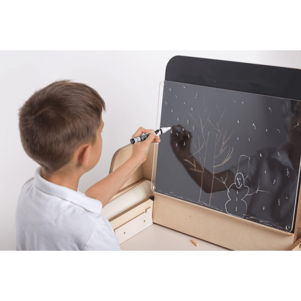 Transformez la chambre en studio d'art et de découverte sensorielle. L'ensemble "Julle" de Luula réinvente le bureau d'enfant en combinant une table d'activités multifonction et une chaise ergonomique rembourrée. Sous son plateau relevable (sécurisé par une clé), se cache un monde de possibilités : un tableau noir pour la craie, une vitre acrylique transparente pour dessiner ou jouer avec du sable, et un vaste espace de rangement pour garder les trésors organisés.